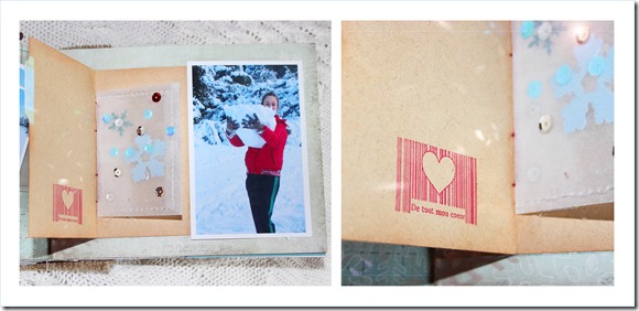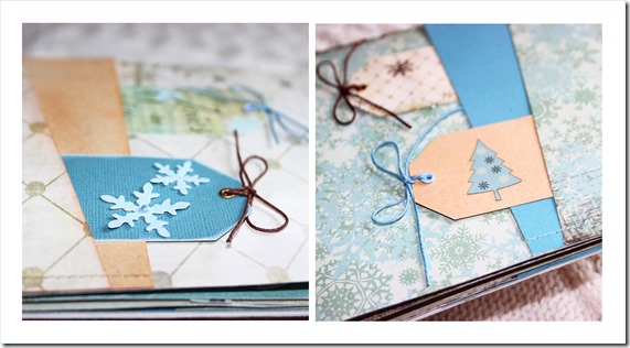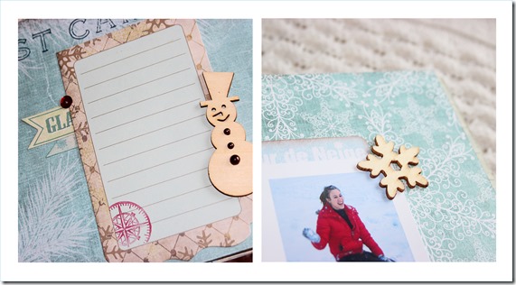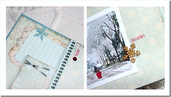 Este es un álbum con muchos detalles así que requiere también de muchas fotos para poder mostrároslo. Y esta vez casi no hemos utilizado purpurina (sólo en un botón, lo que para mí, es casi un récord!) pero no nos hemos podido resistir a poner algo más de brillo con lentejuelas, que ahora están de moda, y que nos han parecido el contrapunto perfecto a la calidez de los adornos en madera.