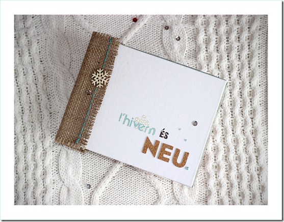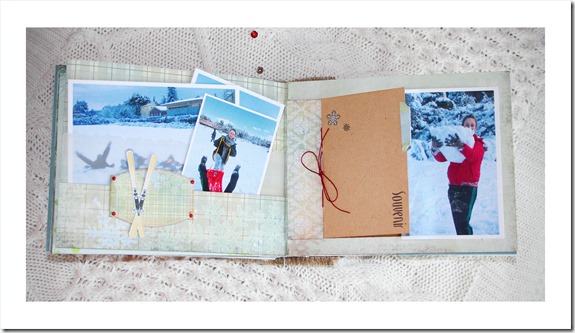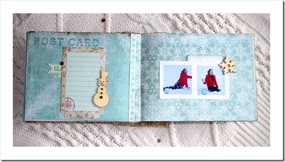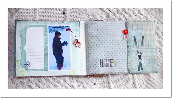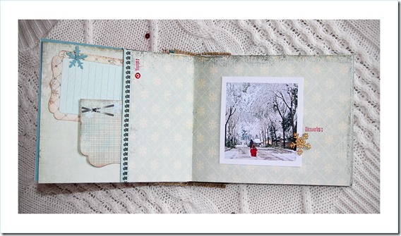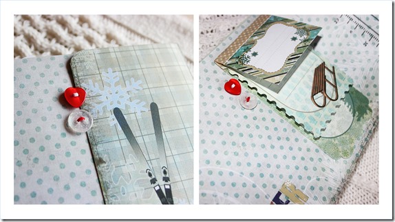 Material: Papeles de la colección Trésor Givré, formas precortadas, mini bloc journaling y adornos de madera de la misma colección, transferibles Etoiles d’Hiver, alfabeto de corcho, cartulinas Mahè, mini perlas marrones y azules, botones transparente y rojo, ojales y micro encuadernadores, sellos acrílicos Destination: Vacances y, D’cos Set Flocons y Frise Flocons.